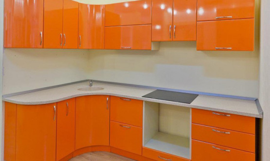 Кухня мдф оранжевого цвета, установлена в Пензе по ул Либерсона. Гнутые фасады на ее окончании были в моде в 2009 году.