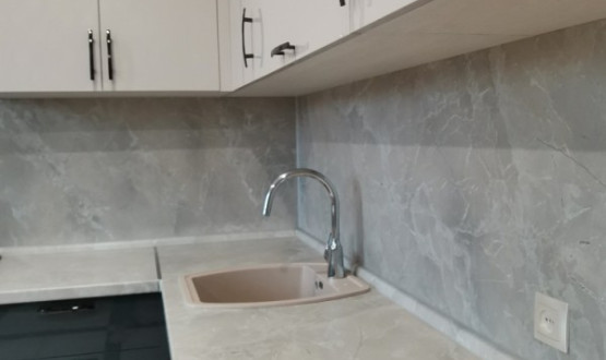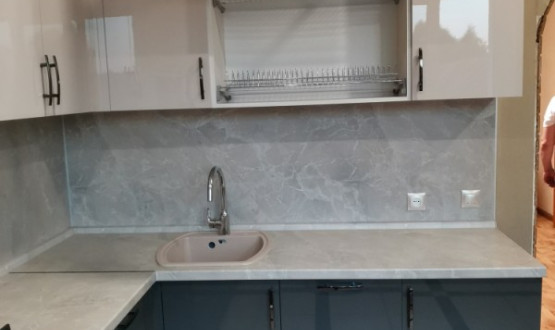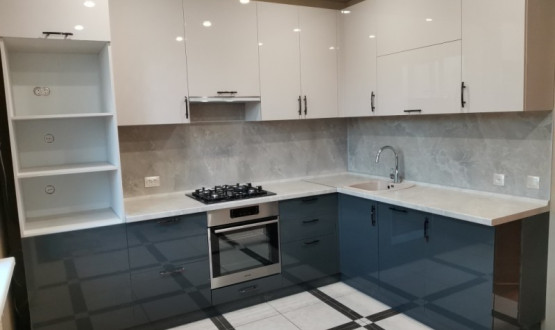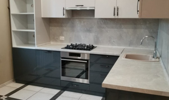 Кухня с темными нижними базами и светлыми верхними навесными шкафчиками. Установлена в поселке "Победа"