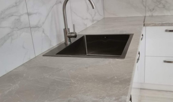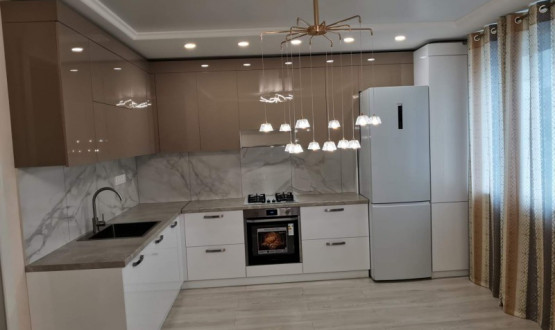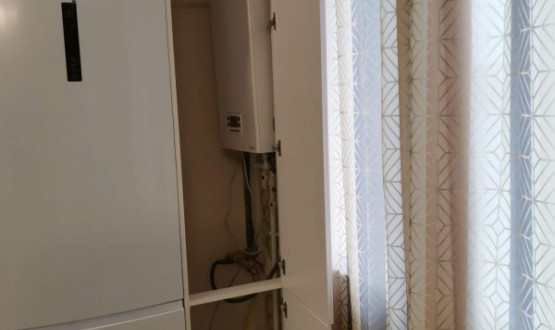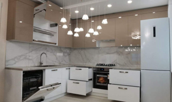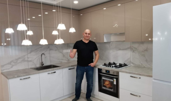 Двухцветная кухня с закрытием газового котла, верхние шкафчики в потолок. Столешница Слотекс "Мрамор серебристый" Установлена в Бессоновке.
