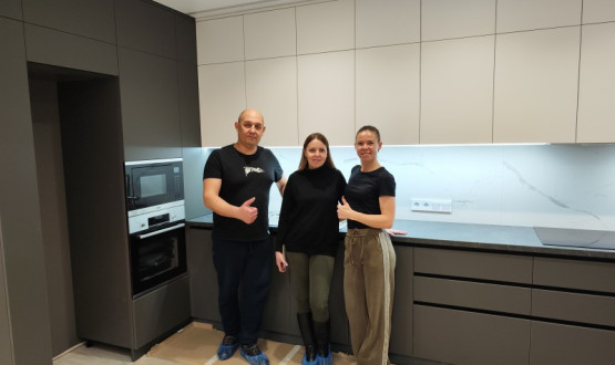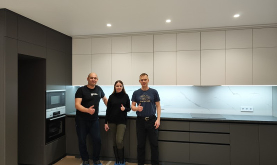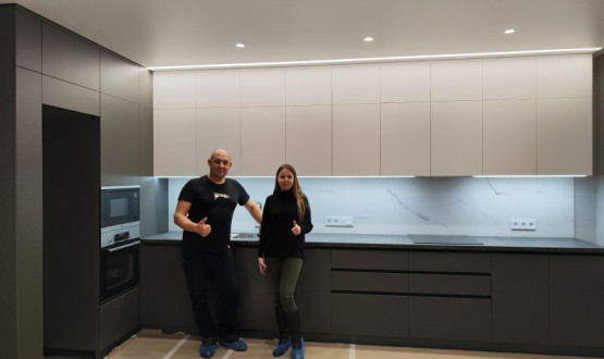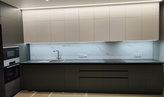 Кухня установлена в Пензе, ЖК "Континет" на Западной, под натяжной потолок с теневым профилем, сенсорная подсветка от движения, столешница "Слотекс" без стыка, фурнитура "Фирмакс".