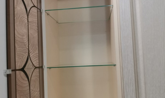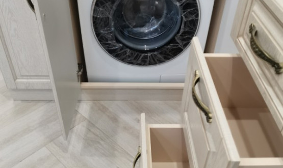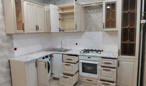 Кухонный гарнитур классический с фрезеровкой и багетом, так же присутствуют фасады с витражными стеклами. Спрятали стиральную машину за фасадами.