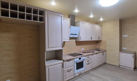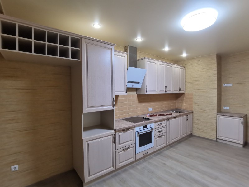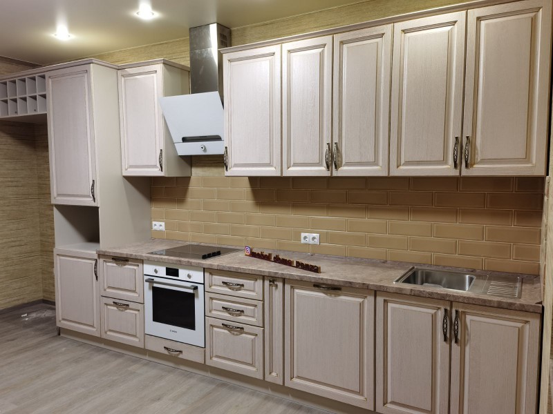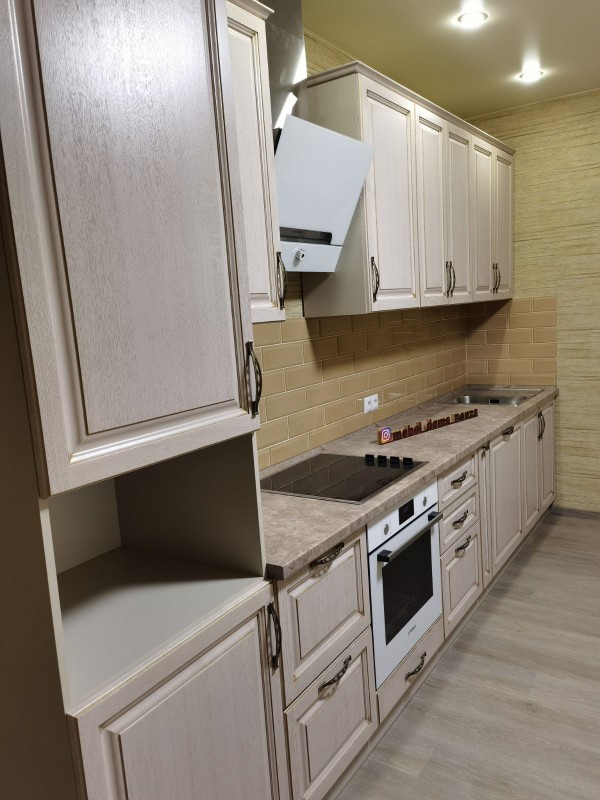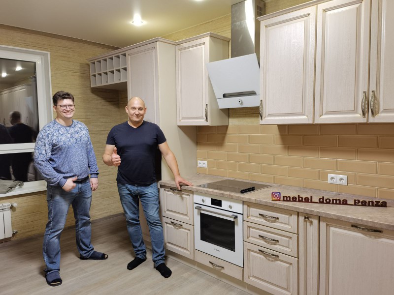 Деревянная кухня на заказ, точнее ее фасады изготовлены из натурального, хорошо просушенного дерева, окрашены в цвет "Слоновая кость"- очень популярный и востребованный цвет.
