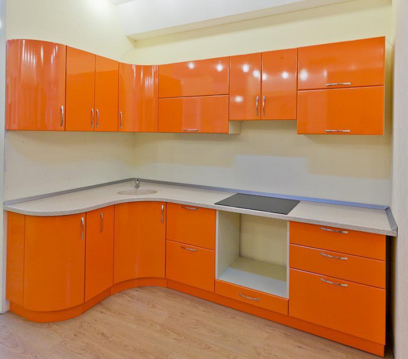 Кухня мдф оранжевого цвета, установлена в Пензе по ул Либерсона. Гнутые фасады на ее окончании были в моде в 2009 году.