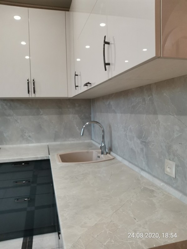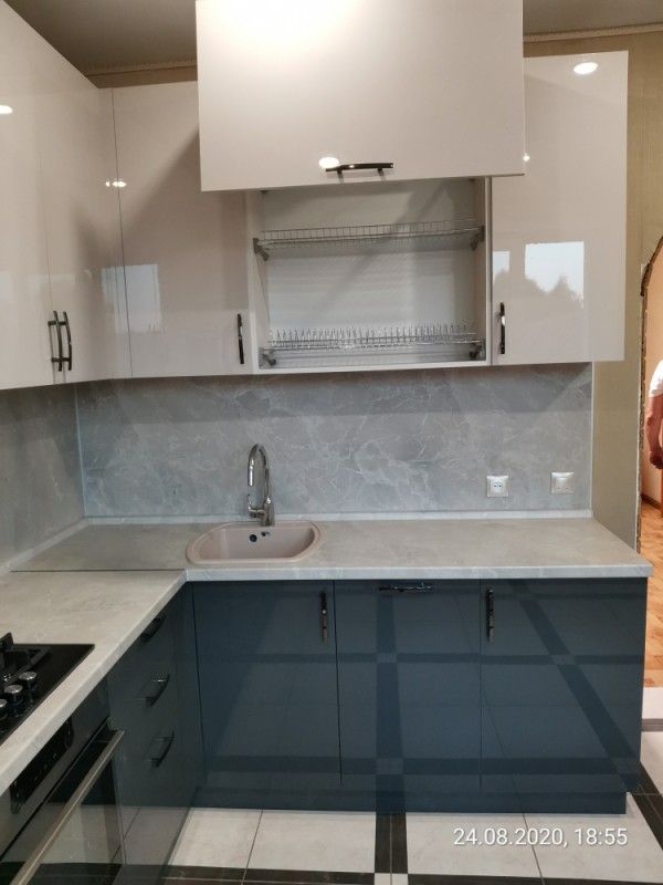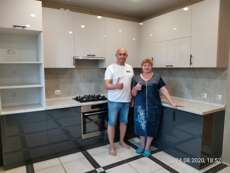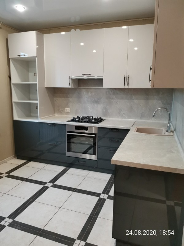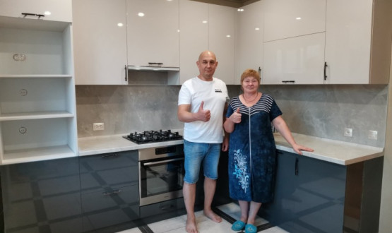 Кухня с темными нижними базами и светлыми верхними навесными шкафчиками. Установлена в поселке "Победа"