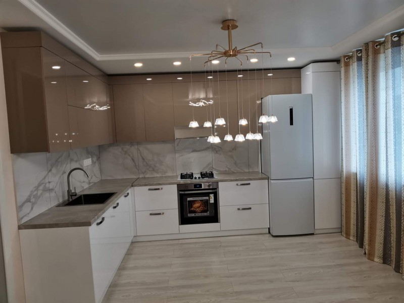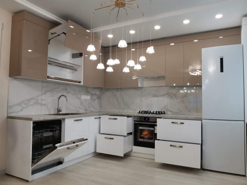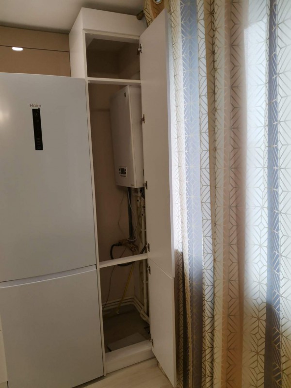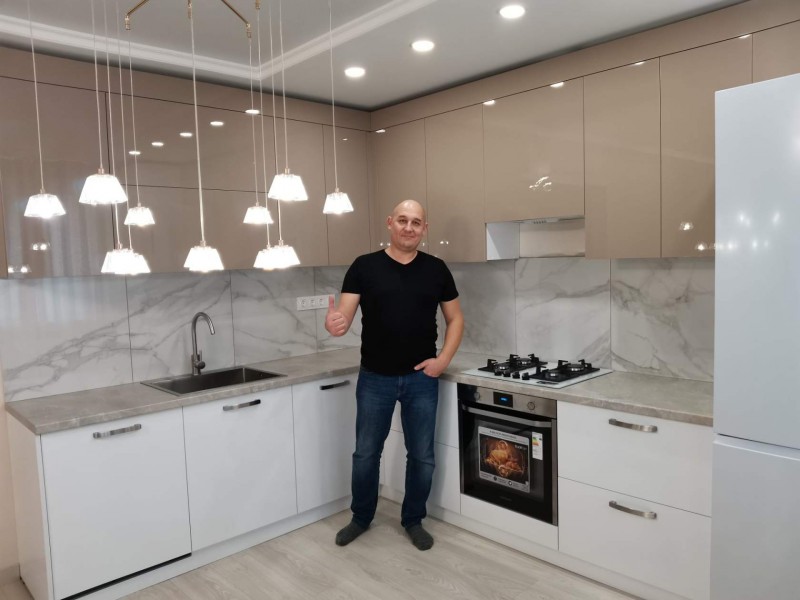 Двухцветная кухня с закрытием газового котла, верхние шкафчики в потолок. Столешница Слотекс "Мрамор серебристый" Установлена в Бессоновке.