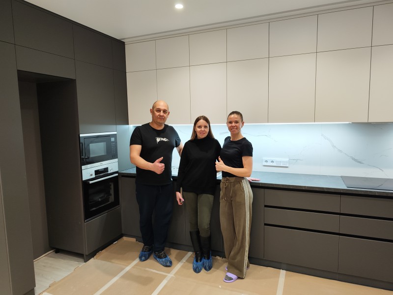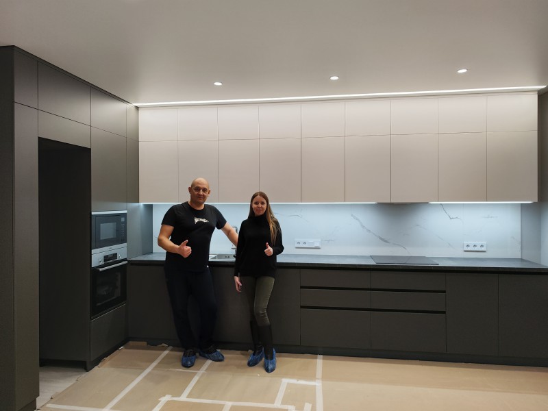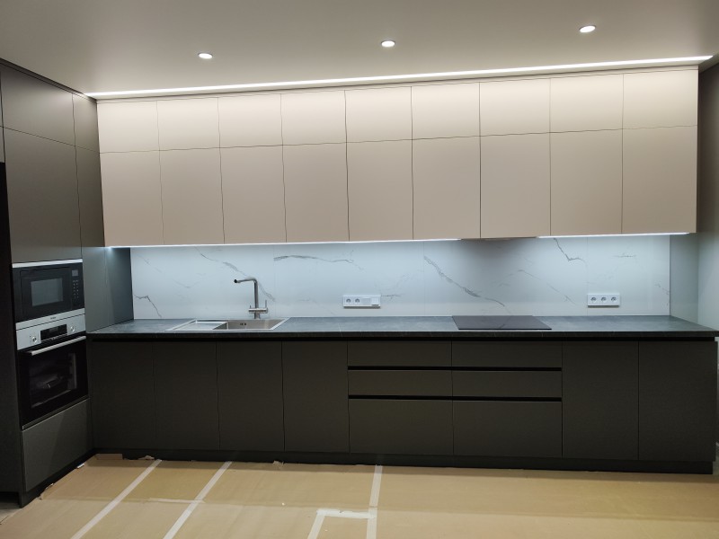 Кухня установлена в Пензе, ЖК "Континет" на Западной, под натяжной потолок с теневым профилем, сенсорная подсветка от движения, столешница "Слотекс" без стыка, фурнитура "Фирмакс".