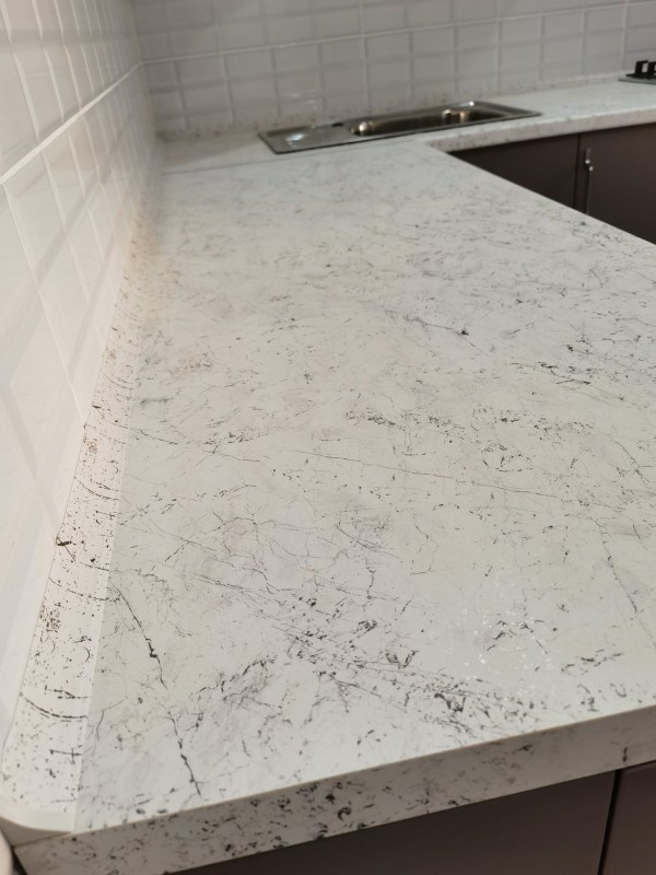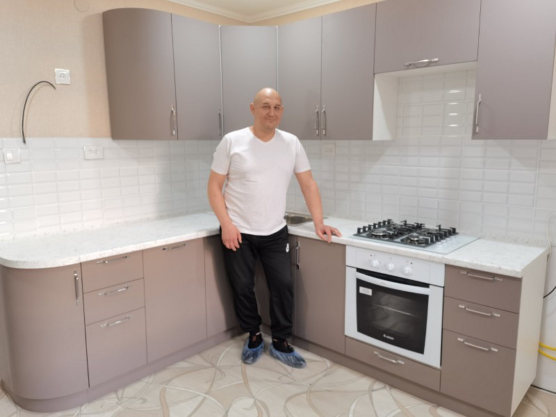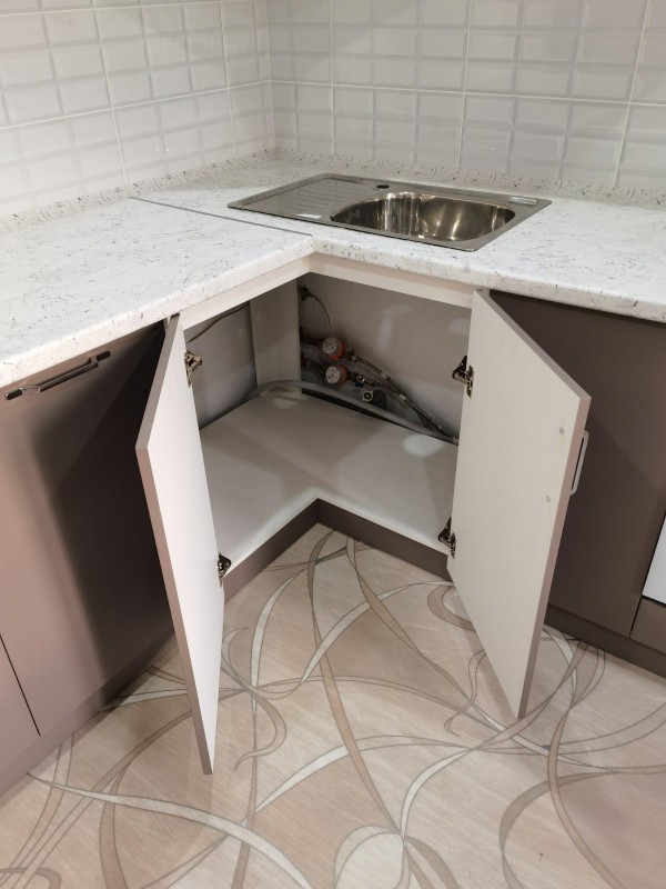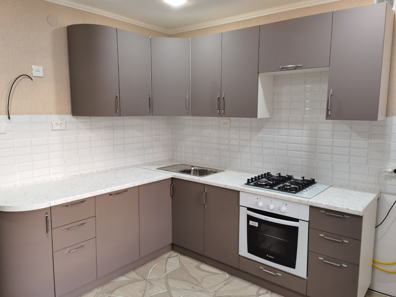 Кухня с огромной угловой базой и скругленным окончанием. Установлена на улице Глазунова.