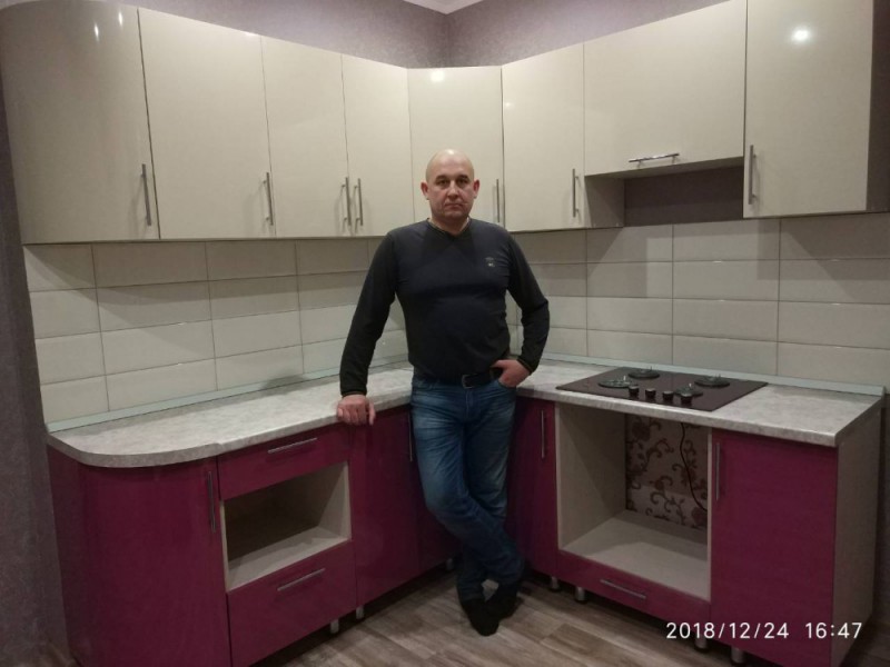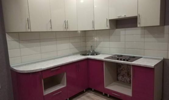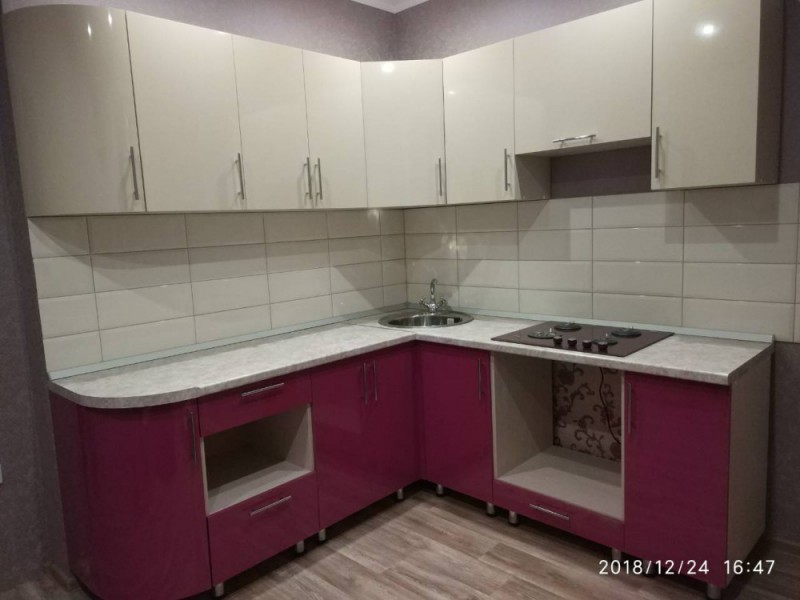 Кухонный гарнитур с нашего производства, установлен в годе Пенза. Розовый низ, цвет "Фуксия" и светлый верх. Приобретайте в нашей компании, огромный выбор цветов, наш дизайнер поможет определиться с именно вашей моделью гарнитура и расцветки.
