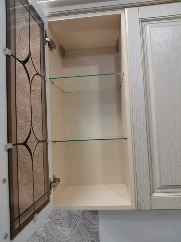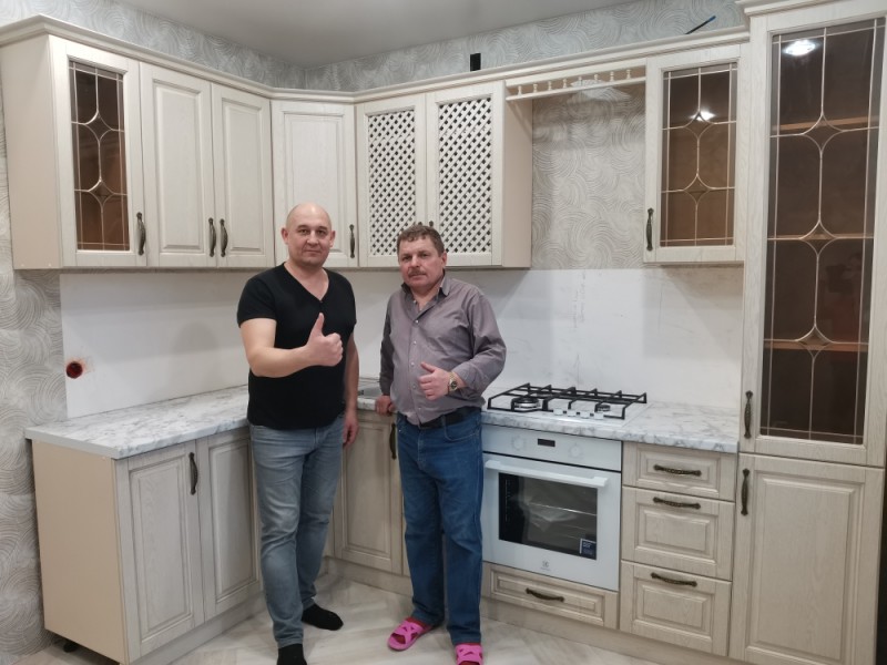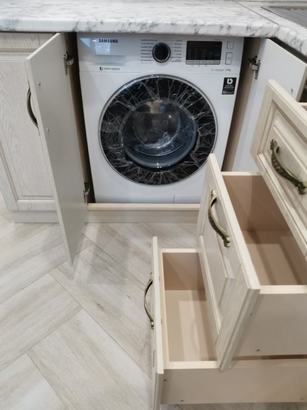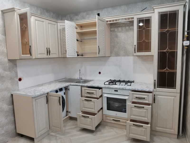 Кухонный гарнитур классический с фрезеровкой и багетом, так же присутствуют фасады с витражными стеклами. Спрятали стиральную машину за фасадами.