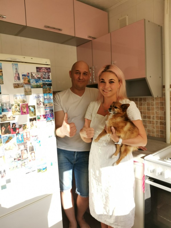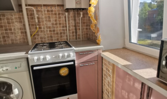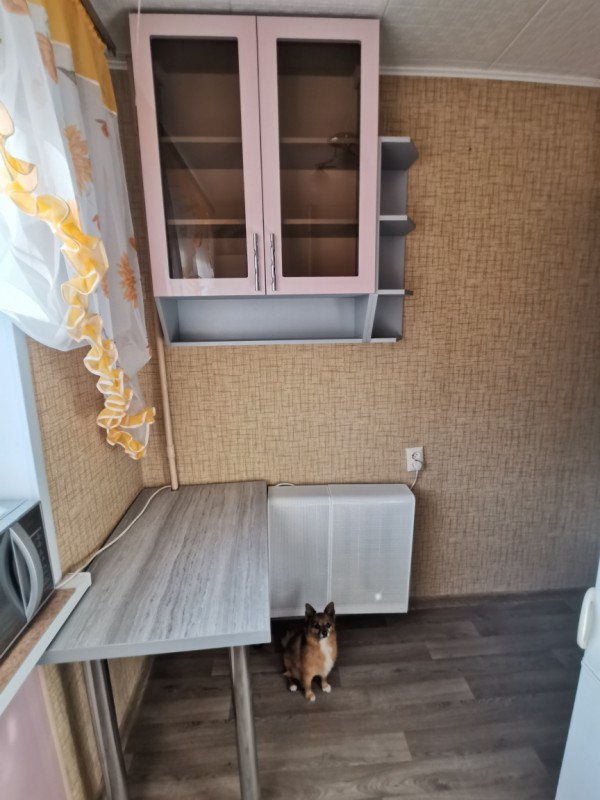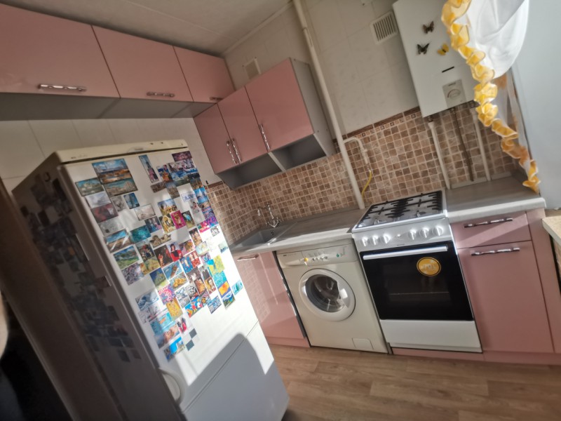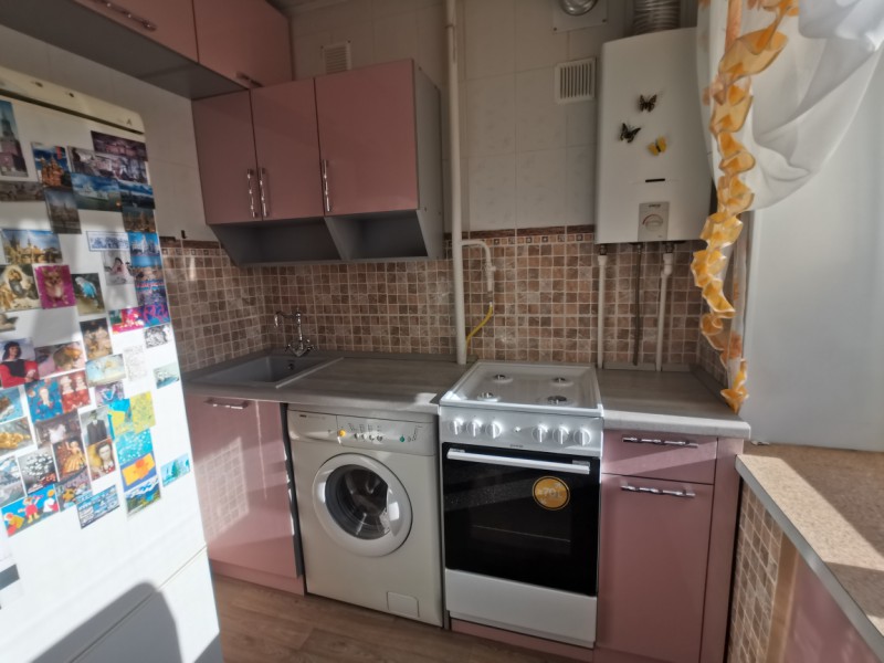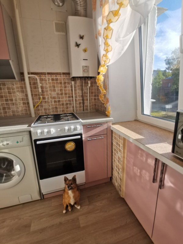 Нестандартная кухня с розовым фасадом, для небольшого помещения. Установлена на улице Карла Маркса, город Пенза.